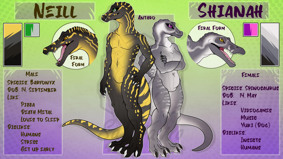 Two different characters are shown from head to toes with additional information; mostly standing close together.